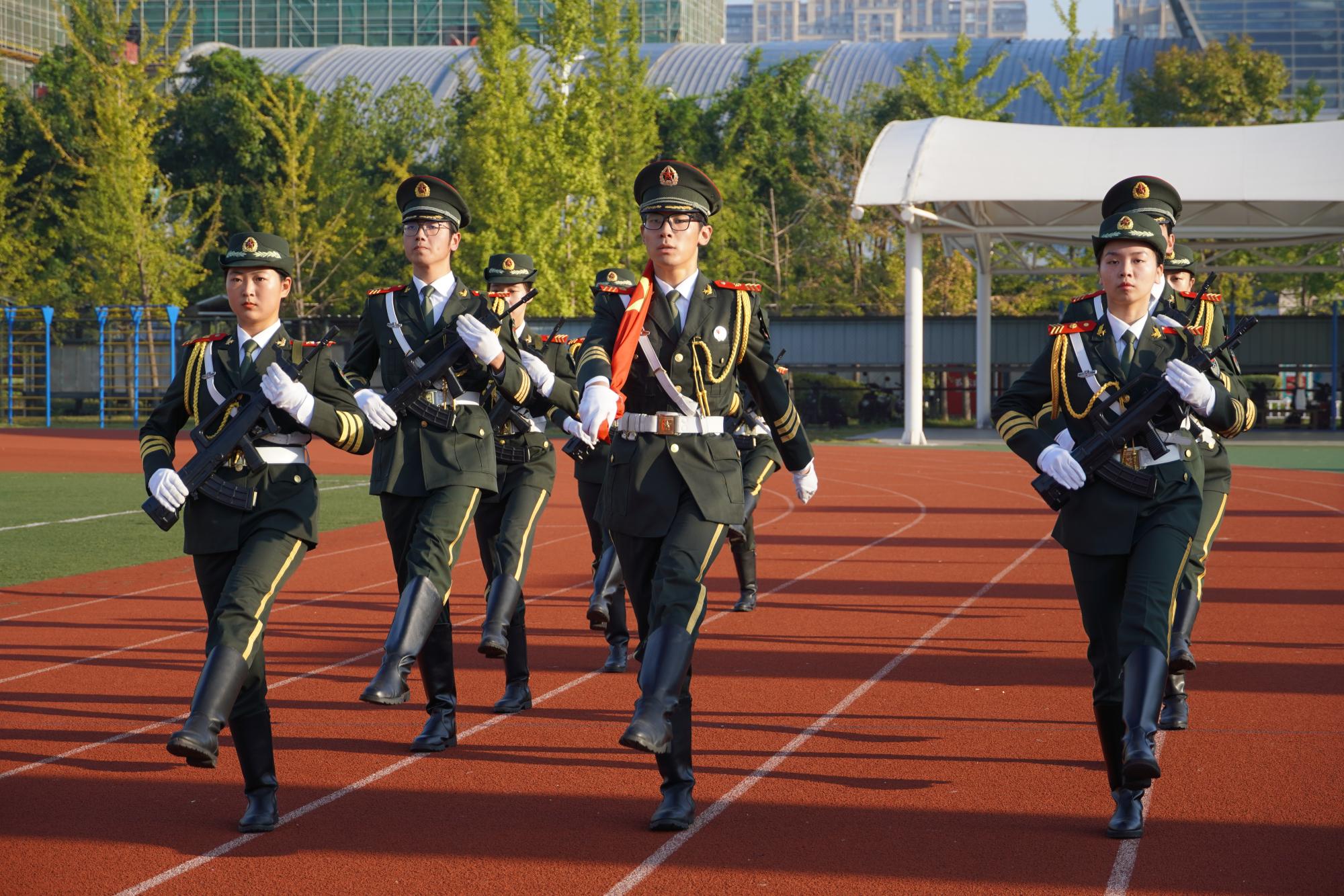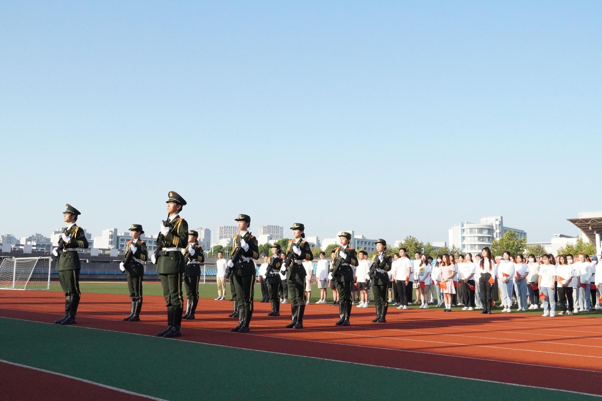7点30分,国旗护卫队成员拥护着鲜红的国旗,踏着铿锵的步伐,昂首阔步迈向国旗台。在国歌声中,参加仪式的全体人员仪容严整,佩戴党徽,肃穆而立。