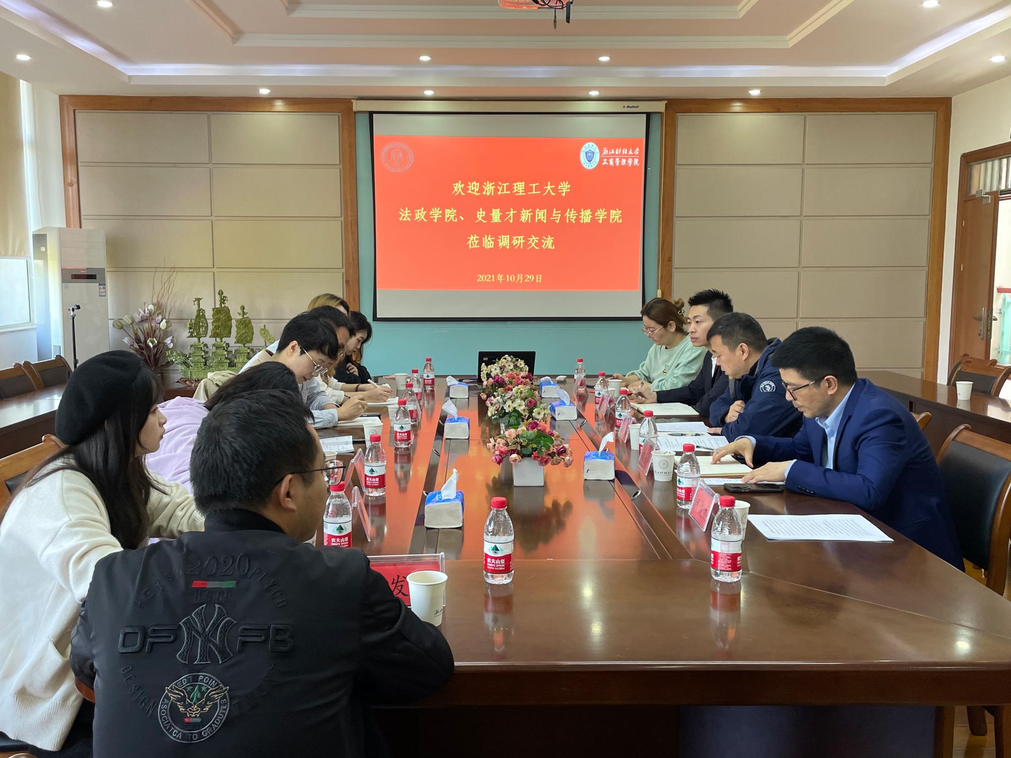 的热情接待表示感谢,介绍了法政学院、史量才新闻与传播学院的基本情况,分享了志愿服务、挑战杯竞赛、法律文化节等方面的工作,并邀请我们到浙江理工大学进行更加深入的了解与合作。