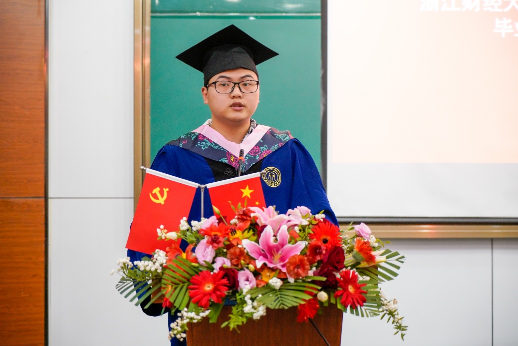 毕业生代表胡志强同学发表毕业感言,他感谢一路伴随前行的师长亲友,并请他们放心,工商的青年一代将不负韶华,不负党和人民的殷切希望,不负师长和亲友的真挚嘱托,在通往远大理想的征途中,不畏“道阻且长”,向着“星辰大海”风雨兼程。