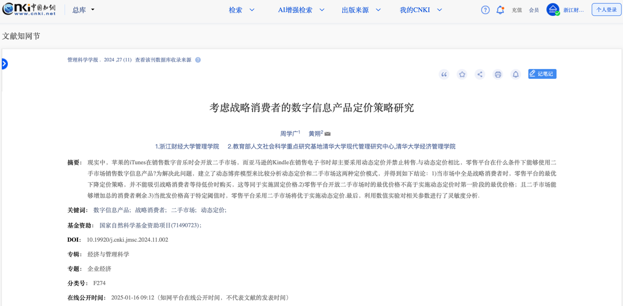 周学广博士作为第一作者,撰写的“考虑战略消费者的数字信息产品定价策略研究”被国内管理科学领域的顶级期刊 《管理科学学报》录用并发表。