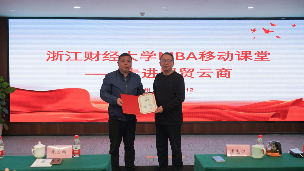 党委书记朱力明为濮志江和鲁霜慧颁发“浙江财经大学MBA社会导师”聘书。