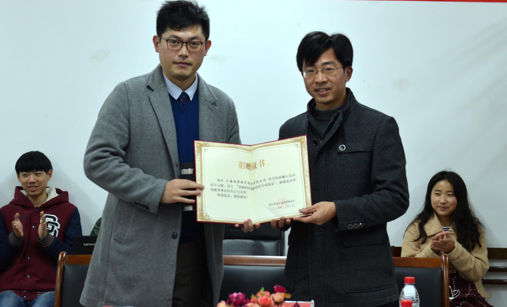 随后,学院党委书记黄卫华、浙江财经大学校友办副主任孙莹、上海高顿教育培训有限公司副总裁王贤瀚举行了三方签约仪式。高顿财经王副总裁向黄卫华书记交递了捐赠支票,王建明副院长向高顿财经王副总裁颁发了捐赠证书与纪念杯。最后,捐赠仪式全体参与人员进行了合影留念。