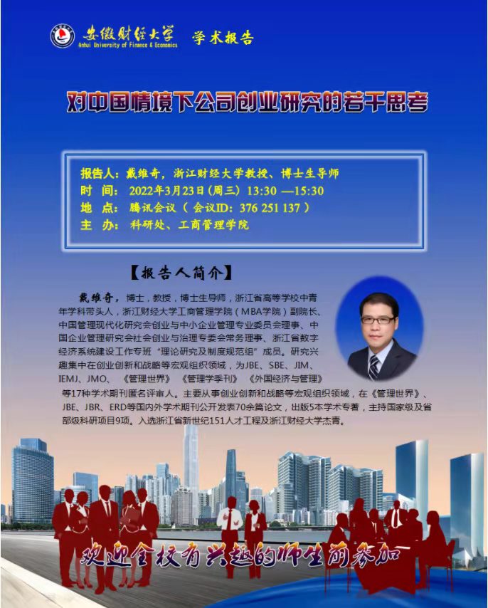 副院长戴维奇教授应邀为安徽财经大学师生做了一场题为《对中国情境下公司创业研究的若干思考》的线上学术报告。南开大学商学院张玉利教授对报告进行了专业点评。会议由安徽财经大学工商球神直播