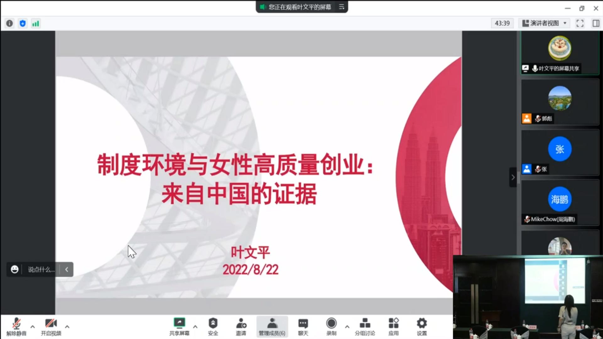 暨南大学叶文平副教授分享了“制度环境与女性高质量创业:来自中国的证据”的研究。创业活动作为潜入社会结构中的经济行为必然受到制度与文化的深刻影响,他的研究回答了女性创业者为何参与创业的比率不断提升。结构性视角主要强调创业机会的数量,新兴经济体的经济体量与市场规模快速增长极大地提高了创业机会的分布,降低了女性创业者的市场准入门槛;功能性视角还特别强调创业活动的社会功能,经济的快速增长必然伴随社会分工的细化和对传统社会角色分工的冲突,加剧了女性的“家庭-工作”冲突。同时,产假制度改革也加剧了劳动力市场摩擦。叶文平副教授的研究从被动选择视角揭开了新兴经济国家女性创业高参与率之谜,拓展了女性创业影响因素的制度分析,比较了正式与非正式制度对女性创业影响作用的差异,具有一定的理论贡献。