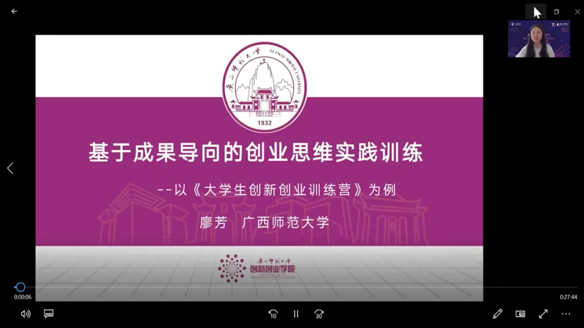 第三位分享的是来自广西师范大学的廖芳老师。她以在学校开展的“大学生创新创业训练营”为例,分享了创业思维课程的教学心得。首先,廖芳老师介绍了该课程从2015年设立至2022年被纳入学校独秀人才培养计划的发展历程。该课程以校内+校外导师、理论课程与项目实训相结合的方式进行实施,并不断优化课程内容和考核要求。之后,廖芳老师分享了该课程的设计思路和教学特色,给与会老师带来诸多启发。