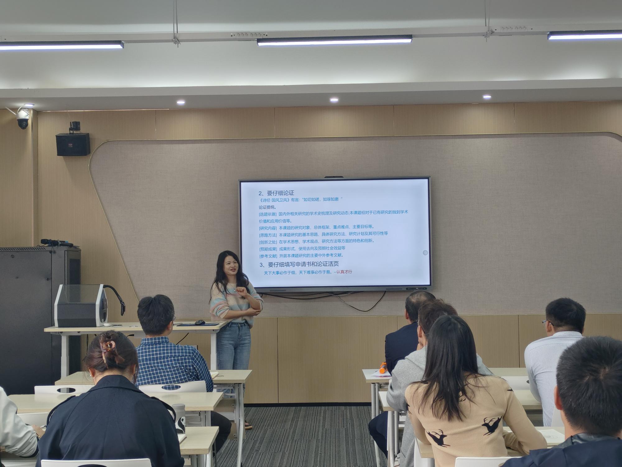 之后,五位老师依次分享自己的申报经验。裴玲玲教授从注意事项、选题方向的把握以及标题的选择与设计方面分享了国家社科项目申报经验,并着重阐述了“跨界+融合”的选题方法。丁雯博士从三年来申报国自科青年项目的经历中,总结了关于选题、研究背景以及文献综述撰写的相关经验,并给出具体可行的建议。邓年奇博士基于申报项目时专家给出的建议进行分享,并详细讲述了自己根据专家建议完善申报书的过程。卢团团博士从选题与定题、提高审美以及学会包装三个方面分享自己申报国家自科项目心得。赵雨菡博士提出申报课题要“胆欲大而心欲小”,既需要大胆破题,也需要细致地梳理逻辑和文字。