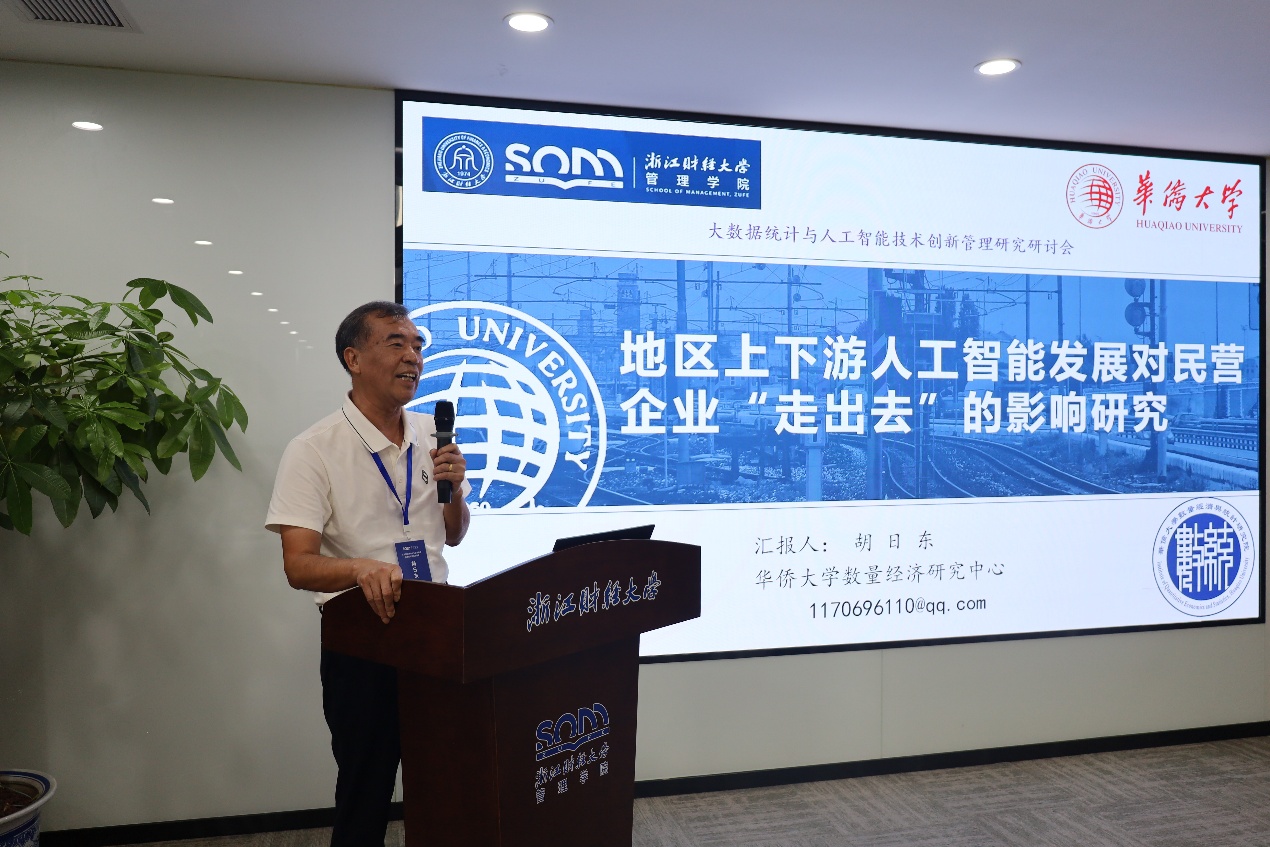院长涂正革教授、华侨大学胡日东教授两位专家特邀报告。涂正革教授分享了“大数据赋能减污降碳协同治理:理论逻辑、实践路径与案例验证”。他指出面对污染源复杂多样、分散难控的挑战,数智化治理上在政策监测排放上已经取得较好成效,未来必须探索更多应用的治理场景,尤其是对数智化绿色生产的赋能,带动源头生产中的减污降碳协同效应。胡日东教授围绕“地区上下游人工智能发展对民营企业‘走出去’的影响研究”进行报告。他提出“地区上下游人工智能发展是否影响以及如何影响民营企业‘走出去’?存在怎样的差异化效应和演变规律?”等议题。他的研究发现下游AI发展显著促进民营企业“走出去”,而上游AI发展的影响相对较弱,证实了AI产业发展存在明显的方向性差异,提出适度加大对下游AI应用生态的资源倾斜,设立"数字贸易服务基金",建设国际化AI应用场景库,同时预留上下游协同创新的发展空间。