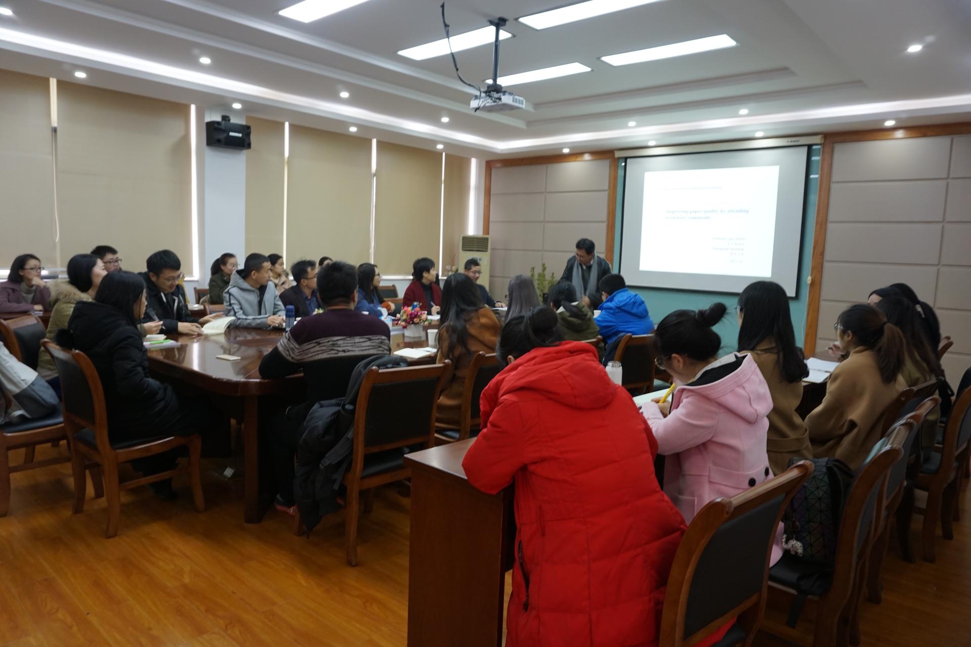 申立银教授的学术报告首先交流的主题是:《Improving paper quality by attending reviews’ comments》。首先,申立银教授给出若干实例,说明了SCI或SSCI投稿中常见的专家评审意见,详细介绍了直接录用、小修、大修和拒稿等几种情况及其成因,并指出了作者相应地修改办法和回复专家的技巧。在接下来的学术交流讨论环节中,申立银教授特别结合其自身的论文撰写、投稿发表等方面的研究心得跟与会者进行了分享。在场的师生也纷纷介绍自己的投稿经验及所遇到的问题,申立银教授分别给予了详尽的解答。