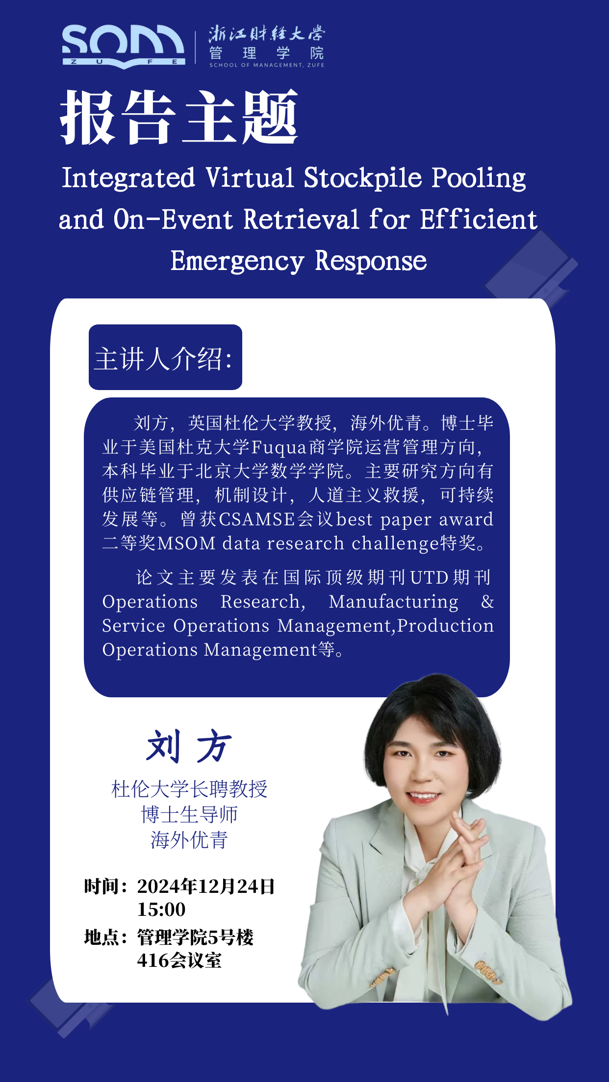 【讲座预告】刘方:Integrated Virtual Stockpile Pooling and On-Event Retrieval for Efficient Emergency Response