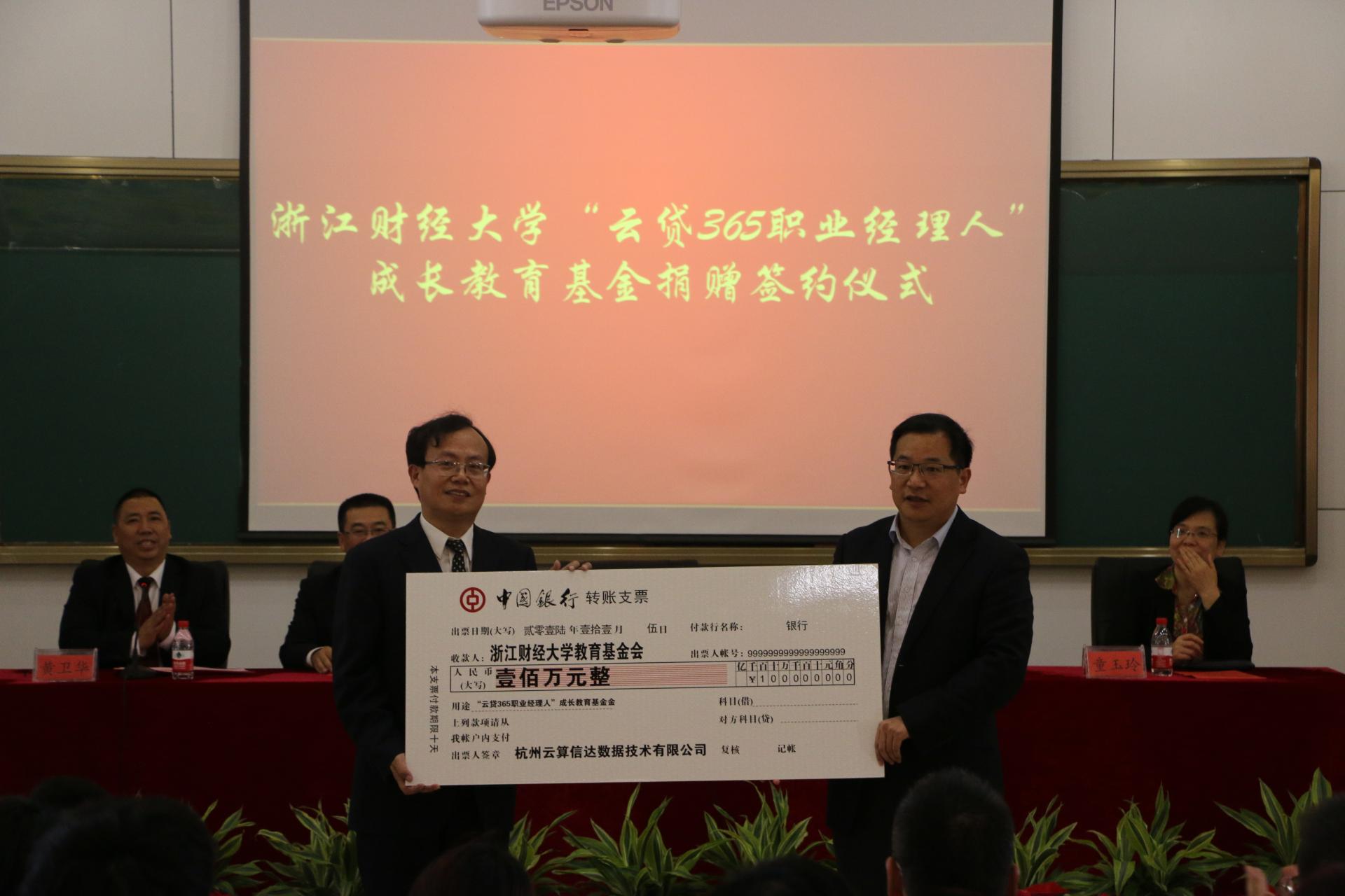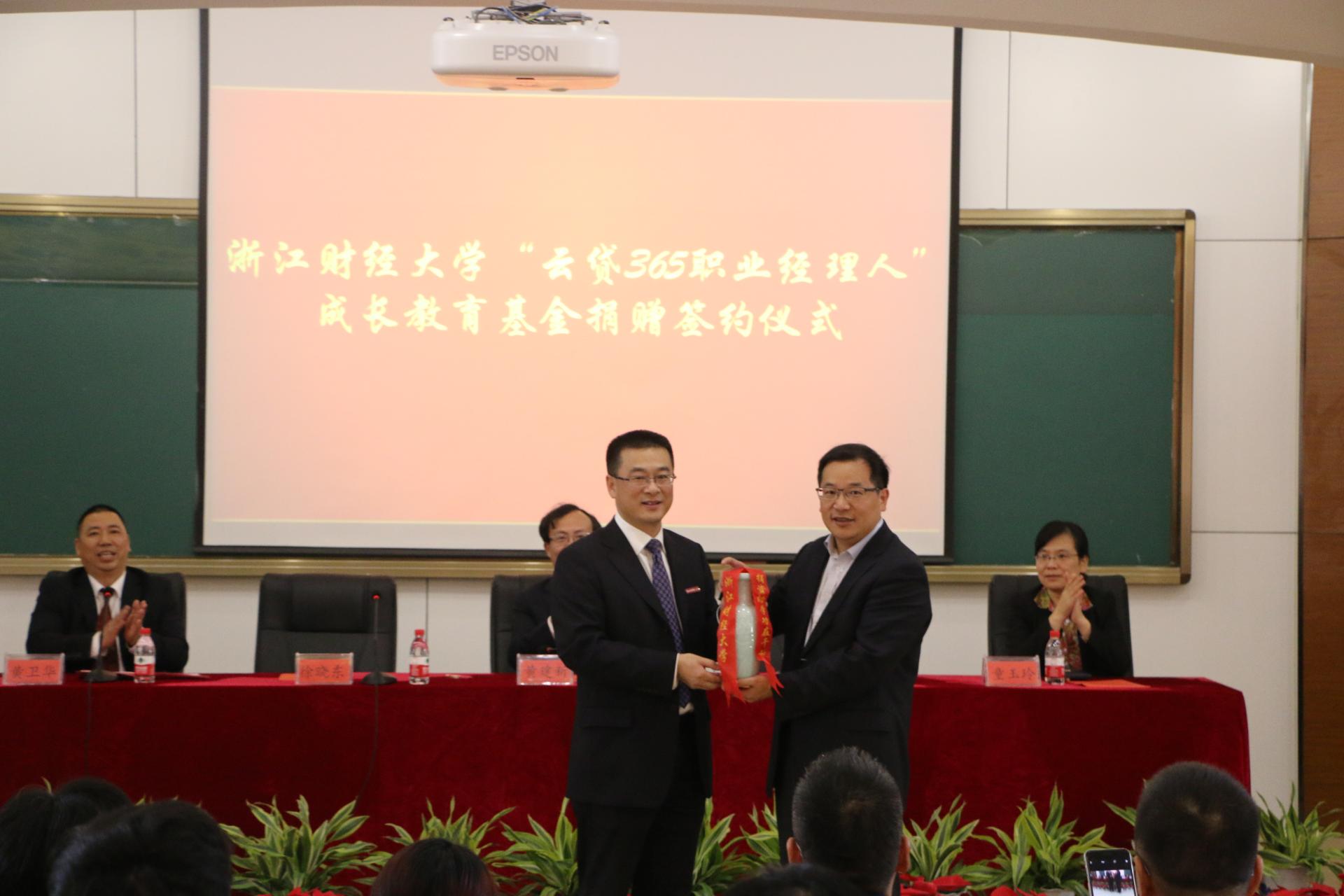 (MBA学院)三方签订了浙江财经大学“云贷365职业经理人成长教育基金”捐赠协议,黄建新副校长代表学校接收了校友交递的壹佰万圆捐赠支票,黄建新副校长和徐晓东部长分别将证书与纪念杯赠予了该校友。