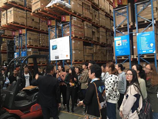 参观过程中,陆总监还特意让一位工作人员操作高位叉车为同学们演示了如何存取货架高处的货物,第一次见识这种存取方式让大家都惊叹不已。参观行走路线旁还不停的有人驾驶着移动式电动托盘车来回穿梭,同学们都觉得很酷炫。当看见一位男生尝试去夹抱一箱海尔冰箱的时候,陆总监还很幽默说:“你尽管抱,抱起来了我就卖给你”。大家都笑了,而这也侧面说明了机械式作业的强大,若是人工搬运,怕是要“忘货兴叹”了。