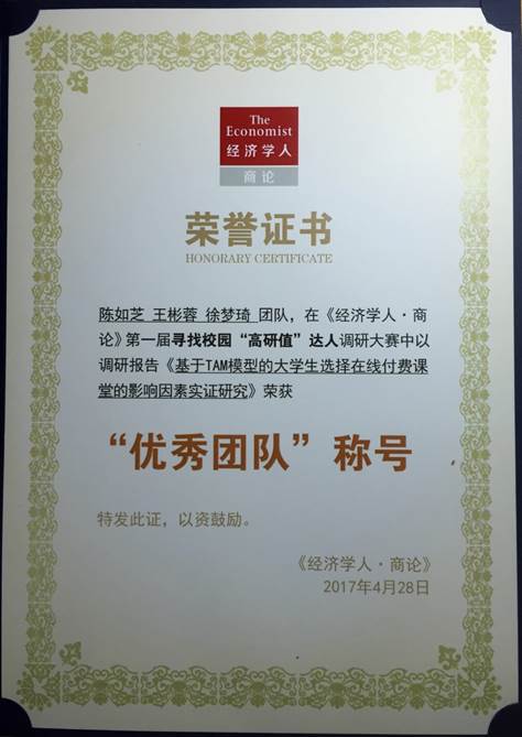 2014级中美市营陈如芝、王彬蓉、徐梦琦等同学,在赵昶老师指导下,参加了由《经济学人》(The Economist)杂志主办的首届“经济学人商论”主题调研大赛,入围全国50强并获得“优秀团队”荣誉称号。