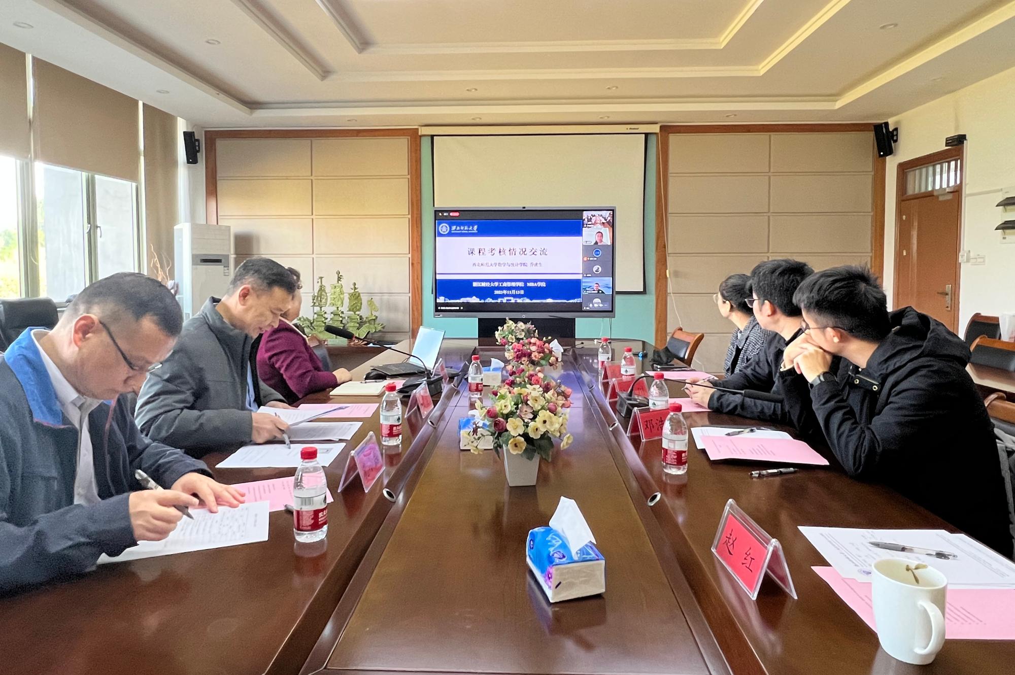 副院长张雷教授,课程负责人沈渊教授,课程组成员戚筱雯、林与川、邓浩然等老师及督导组孔小磊老师;线上参会人员主要包括西北师范大学数统学院副院长乔虎生教授、西北农林科技大学王永强教授、系主任吴丽民老师、课程组成员赵昶、罗兴武等老师。张雷副院长主持会议。