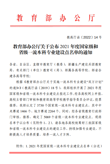 近日,根据《教育部办公厅关于公布2021年度国家级和省级一流本科专业建设点名单的通知》(教高厅函〔2022〕14号),球神直播app