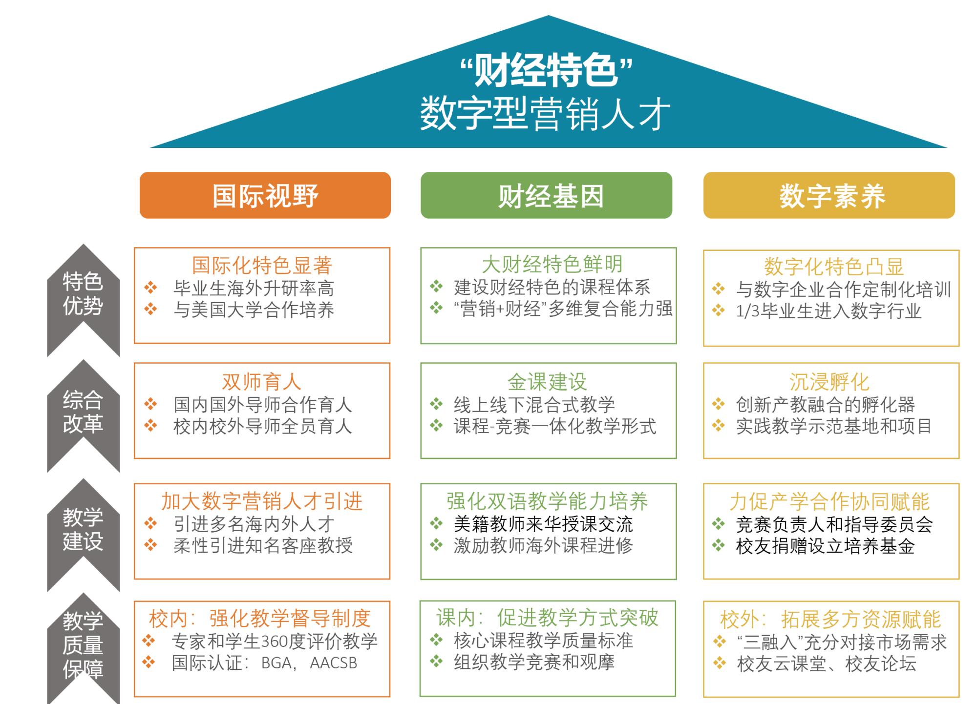 浙江财经大学市场营销专业创建于1994年,依托工商管理国家一流学科,一级学科硕士学位点、MBA学位点,专业排名全国位列前4.08%,于2020年入选国家一流本科专业建设点。专业建有省级实验示范中心4个,省财政支持实验室1个,教育部产学合作协同育人项目7个,校外实践基地44个。有国家社科基金重大项目首席专家1人,省级人才工程2人,师德先进个人2人,中国高校市场学研究会常务理事2人、理事10人。基于强势学科平台、实践平台和师资队伍,形成了“国际化+大财经+数字化”人才培养优势。面向“互联网+”和国际化浪潮,对接浙江经济社会发展“数字经济、智能制造、互联网金融”等高端产业需求,培养具有国际视野和财经特色的数字型营销人才。