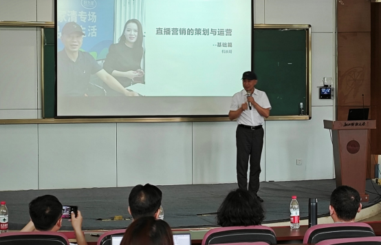 讲座开篇,肖和成先生从直播营销的概念引入,通过向同学们提问的方式详细介绍了一场完整的直播带货操作流程,并就直播间场景布置、岗位职责分工、设备使用、灯光布置、带货技巧等进行了系统阐述。此外,他还结合自身丰富的经验,通过列举大量具体案例,对开播前、直播中、下播后的工作作了具体讲解。