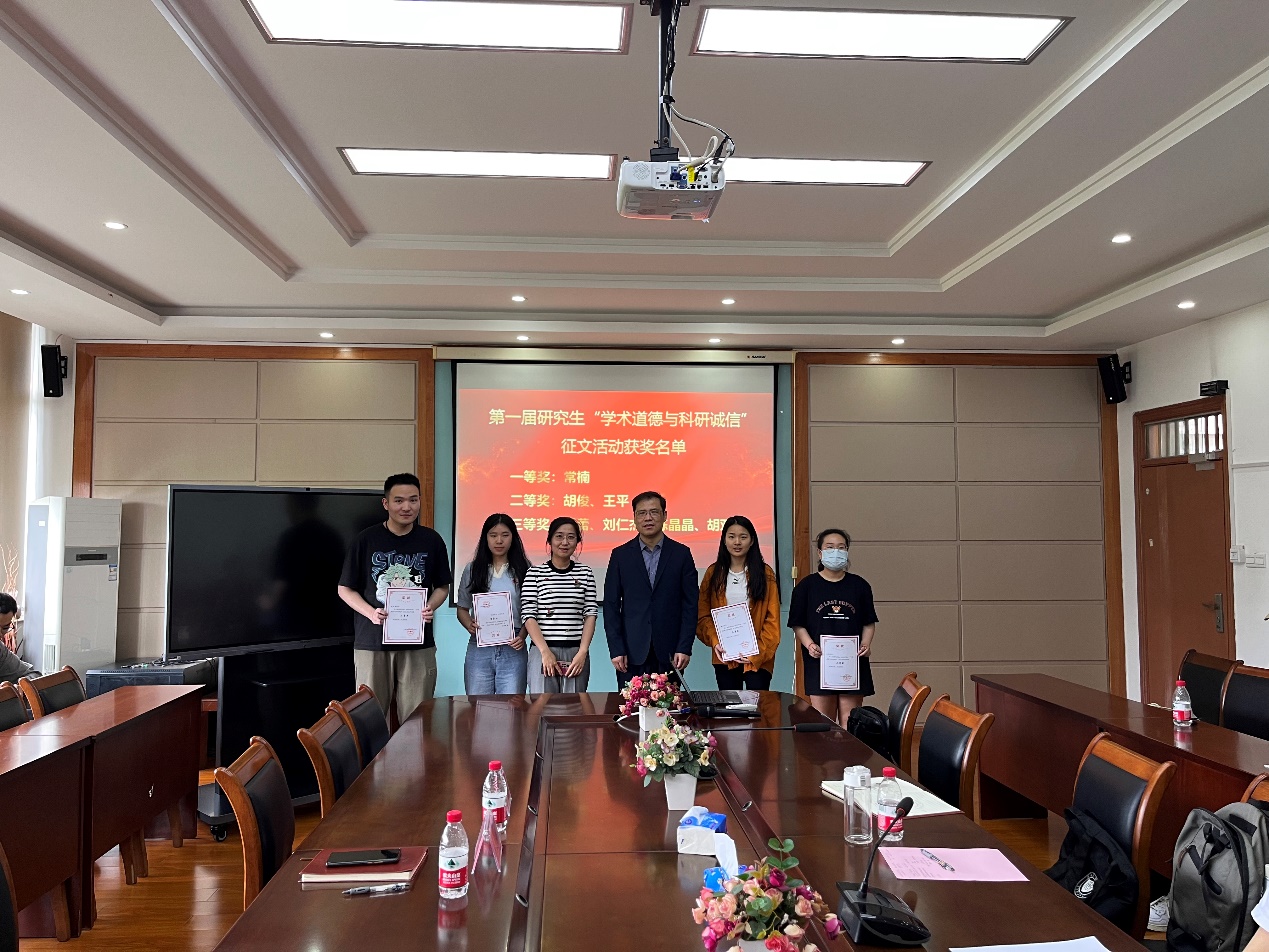 随后,戴维奇副院长为第一届”学术道德与科研诚信“征文活动获奖学生颁奖。颁奖结束后,全体获奖学生合影留念。