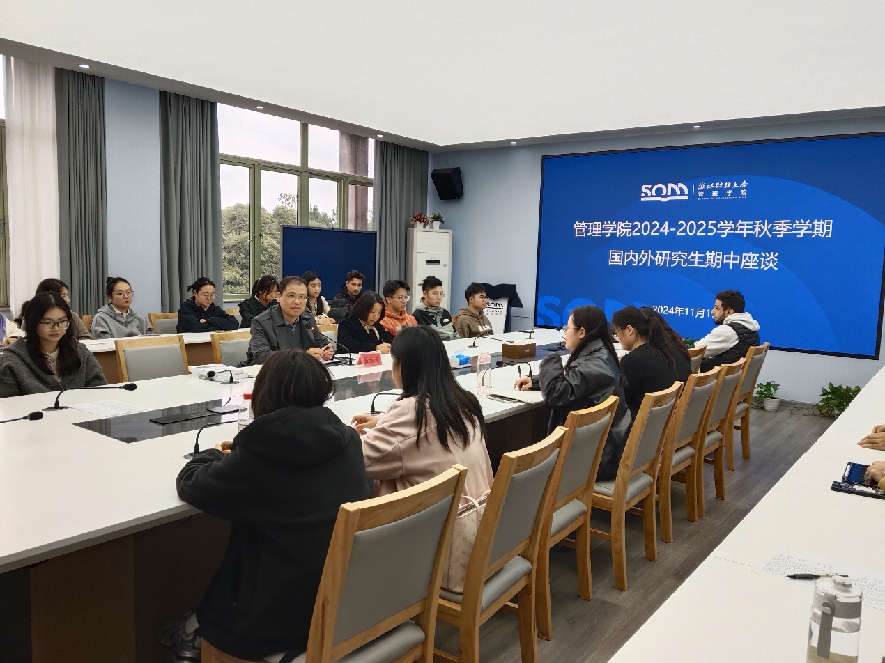于5号楼416会议室圆满举办了2024-2025学年秋季学期国内外研究生期中座谈会。此次会议由学院副院长戴维奇教授主持,研究生教学督导邱瑾教授、研究生秘书徐璐老师以及31位国内外研究生代表,共同探讨了研究生课程教学和培养管理的现状与挑战。