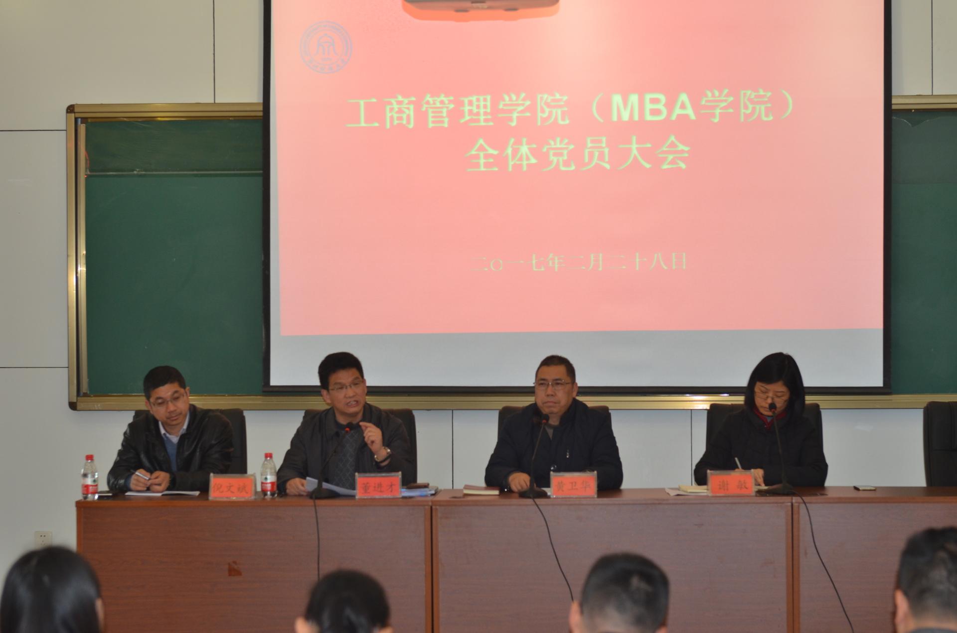 (MBA学院)党员大会在学院楼217会议室召开。院长董进才、党委书记黄卫华、党委副书记谢敏、副院长倪文斌等学院领导、学院教职工党员及研究生党员、各本科生支部委员等参加了本次会议,会议由学院党委书记黄卫华主持。
