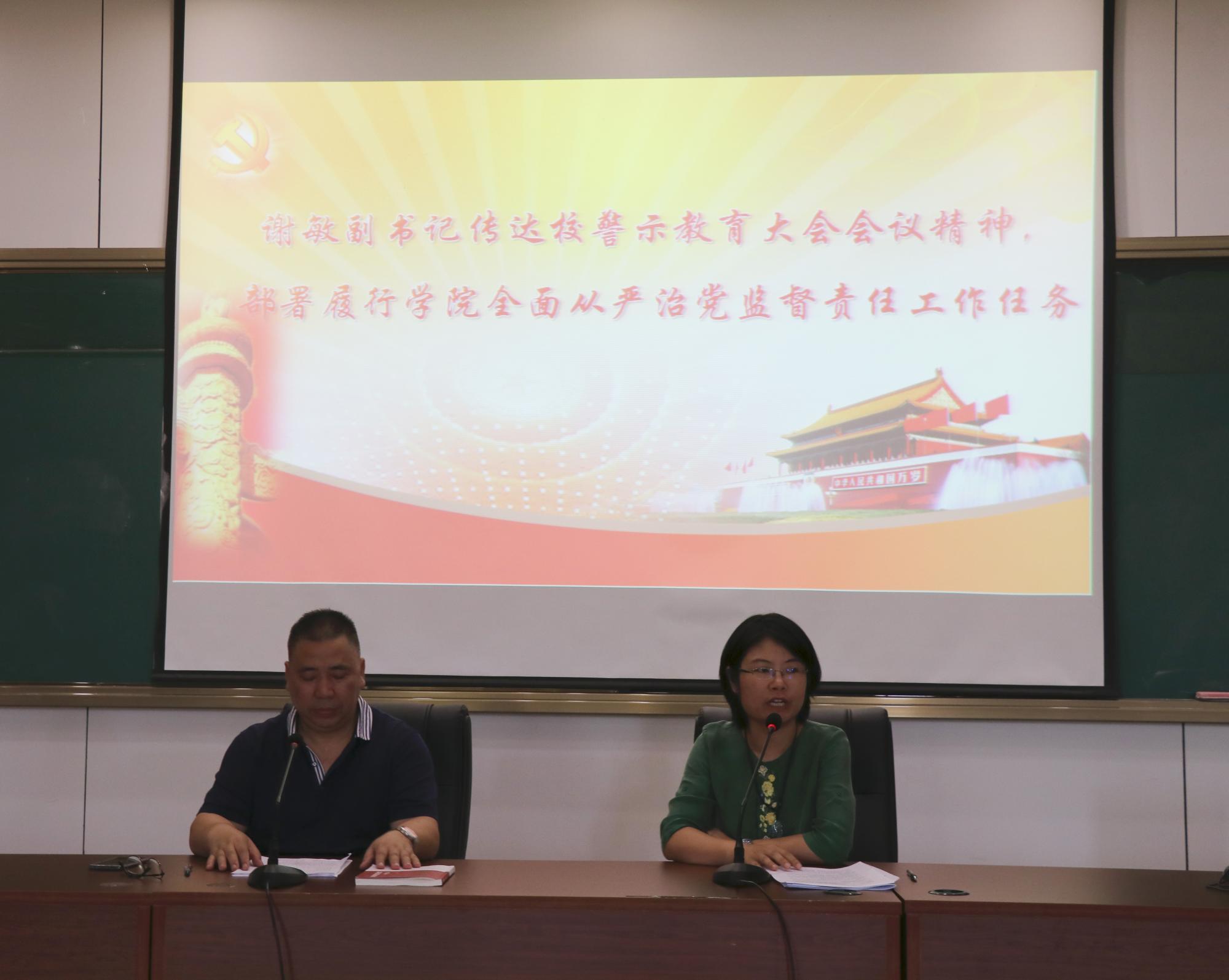 学院党委副书记、纪委书记谢敏向与会人员传达了校警示教育大会会议精神并部署履行学院全面从严治党监督责任工作任务。谢敏副书记从学校的典型案例出发,提醒全体教职工要警钟长鸣,全面提高自身思想认识,筑牢廉政风险管控的防火墙。她指出,学院纪委将始终不断加强制度建设来强化监督体系,并通过打造“习廉理”廉政文化品牌来深化学院廉政教育,营造学院风清气正的良好育人环境。