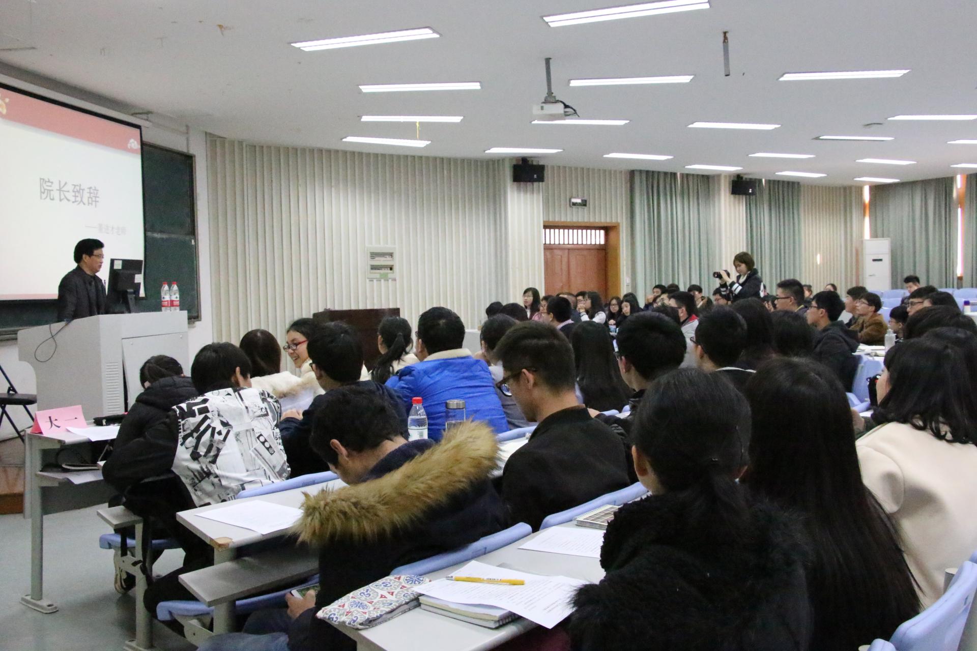 和MBA学院组合而成,提出学院新发展愿景。着重强调了学院核心工作是学生培养,因此他希望老师与同学们多沟通,建立起良好的关系。对于学院建设,他认为应积极响应创新创业的号召,主张将学生工作与学科建设、专业建设结合在一起,以能力培养为核心构建学生活动,鼓励同学们在学科竞赛上投入更多精力,从竞赛中提升自己。他还指出学院人才将做分类培养,针对考研方向、就业方向采取不同的人才培养方案。此外他再次强调了学风建设方面的“三无两高”课堂,指出树立良好的学风是关键,学生干部应当做好表率,塑造良好的学习氛围。