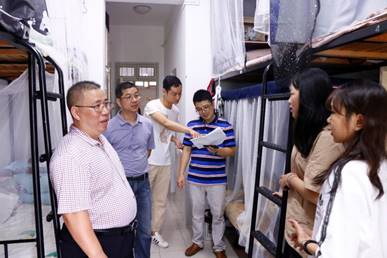 院长董进才、党委书记黄卫华、党委副书记谢敏、副院长王建明、副院长倪文斌及全体辅导员走访本科生、研究生宿舍,对学生进行关爱慰问活动。