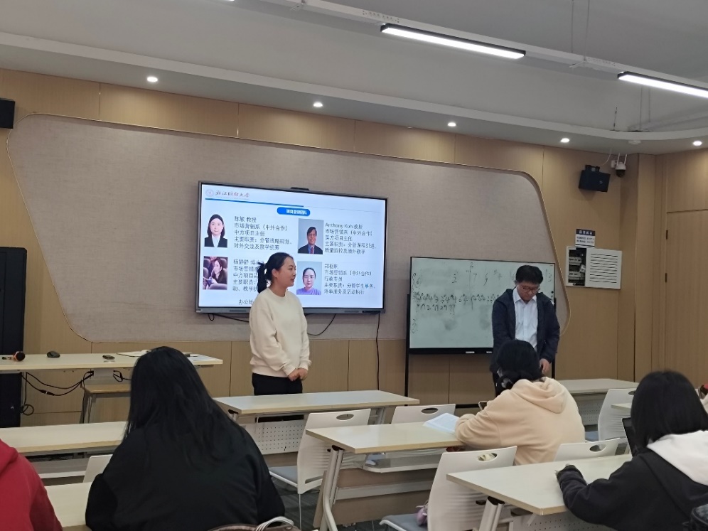 会议伊始,李桢老师向新生班干部介绍了中美营销项目组的整体架构、教师分工及工作职责,详细说明了项目在课程衔接、学籍管理和教学安排等方面的运行机制。他指出,班干部既是项目与同学之间沟通的桥梁,也是班级学习氛围与组织秩序的引导者,希望大家在日常工作中主动传达信息、反馈问题,形成高效、畅通的协同机制。
