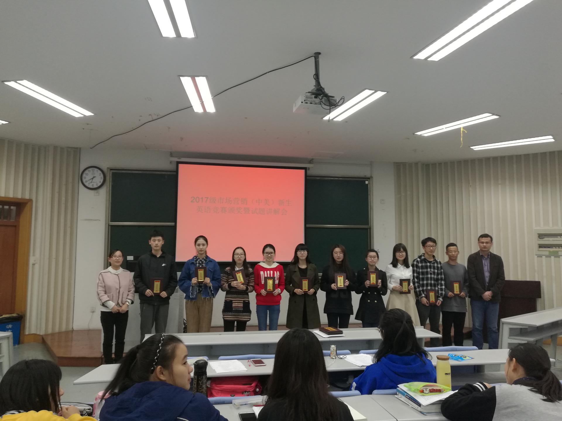 2017年11月8号晚6点半,2017级市场营销(中美)新生英语竞赛颁奖会及试题讲解会在学院楼115教室顺利举行。工商球神直播
