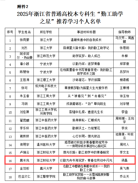 莫长凤同学成功获得浙江省“勤工助学之星”推荐学习个人。