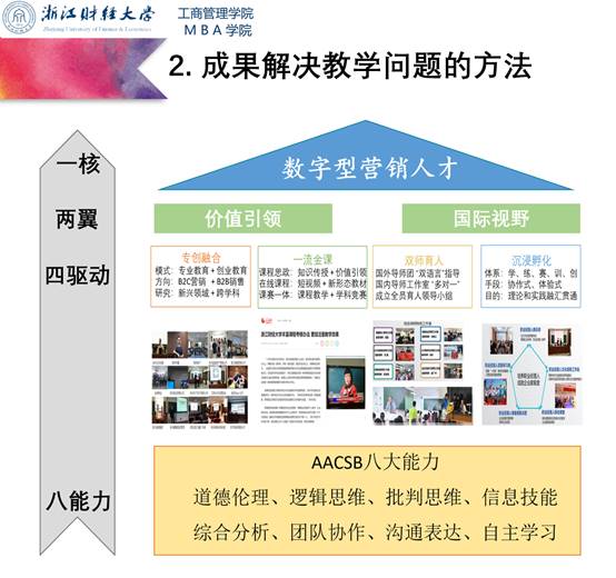 浙江财经大学市场营销系基于九年的教学实践,结合市场营销中美合作办学项目——专业销售(Profession sales),向本次大会提交阐述了《AACSB核心能力视角下“一核双翼四驱”中美合作项目营销人才培养模式》(完成人:王建明、陈颖、王建国),荣获教学成果奖三等奖殊荣。