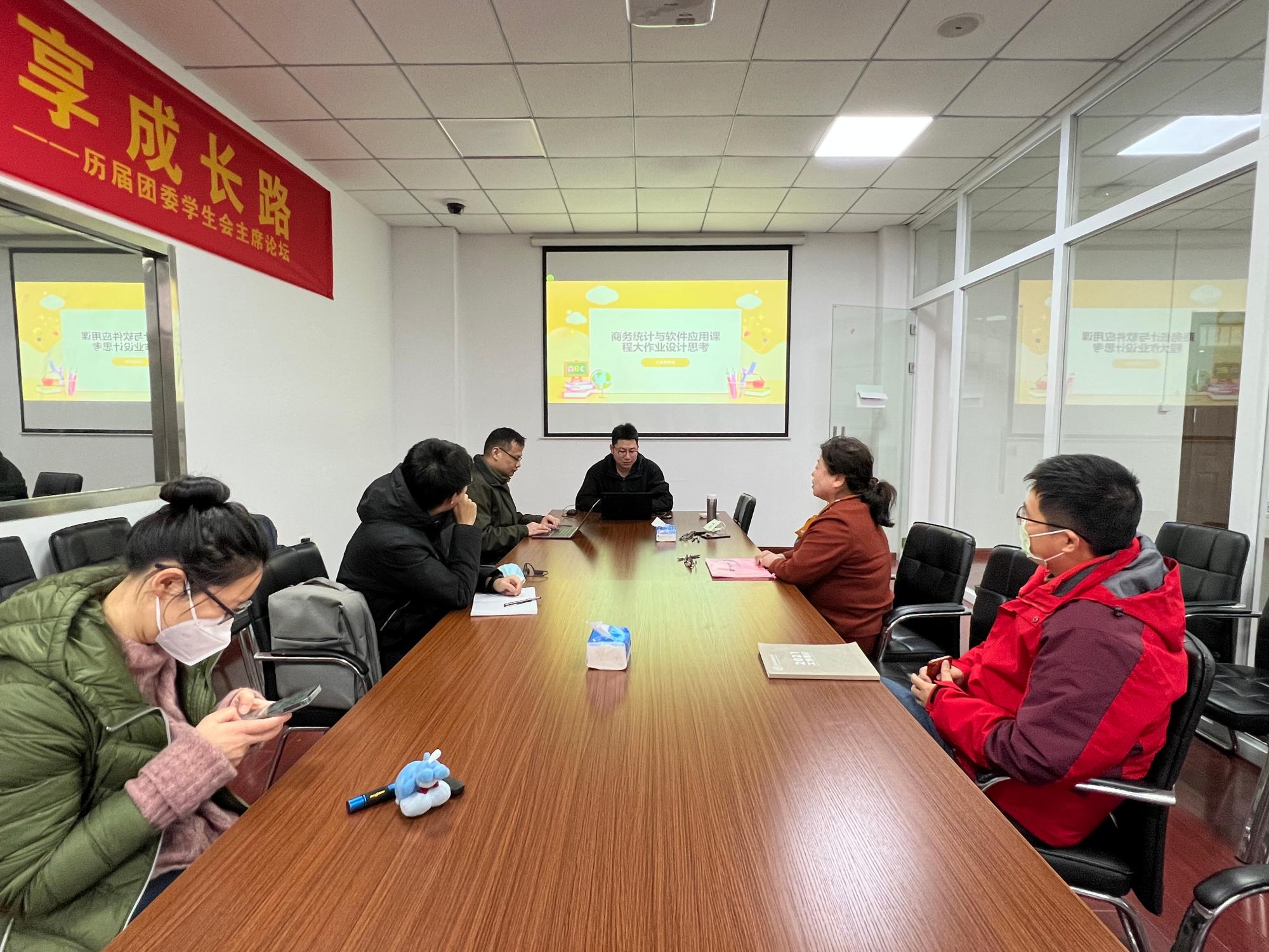 2022年12月13日下午学院5511会议室,工商管理系《商务统计与软件应用》课程组开展集体备课活动。本次活动有两个主题:一是对加入教学团队的新教师进行课程教学内容培训;二是寻求团队作业质量难把控的破解之道。旨在发挥对新教师的传帮带优良传统,同时促进任课老师之间的交流与提升。集体备课活动由系主任吴丽民主持,院督导孔小磊老师负责记录,沈渊老师,戚筱雯老师,包兴老师,林与川老师,邓浩然老师,教学办赵红老师参加了本次活动。