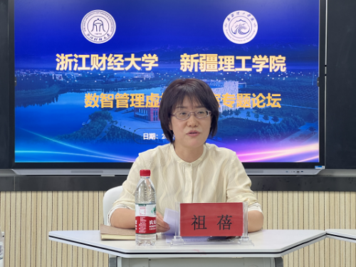 论坛下半场,祖蓓代表新疆理工学院对浙江财经大学叶舟、邬雪芬、陈颖三位“金课援疆”教授的到来表示热烈欢迎,她讲到:浙江财经大学先后派遣多名高层次人才加入援疆队伍,新疆理工学院的今天离不开贵校的鼎力支持。本次论坛为两校交流与搭建了绝佳平台,希望以此次论坛为契机,为浙阿两地经济社会高质量发展、培养更多社会主义建设者与接班人发挥作用。
