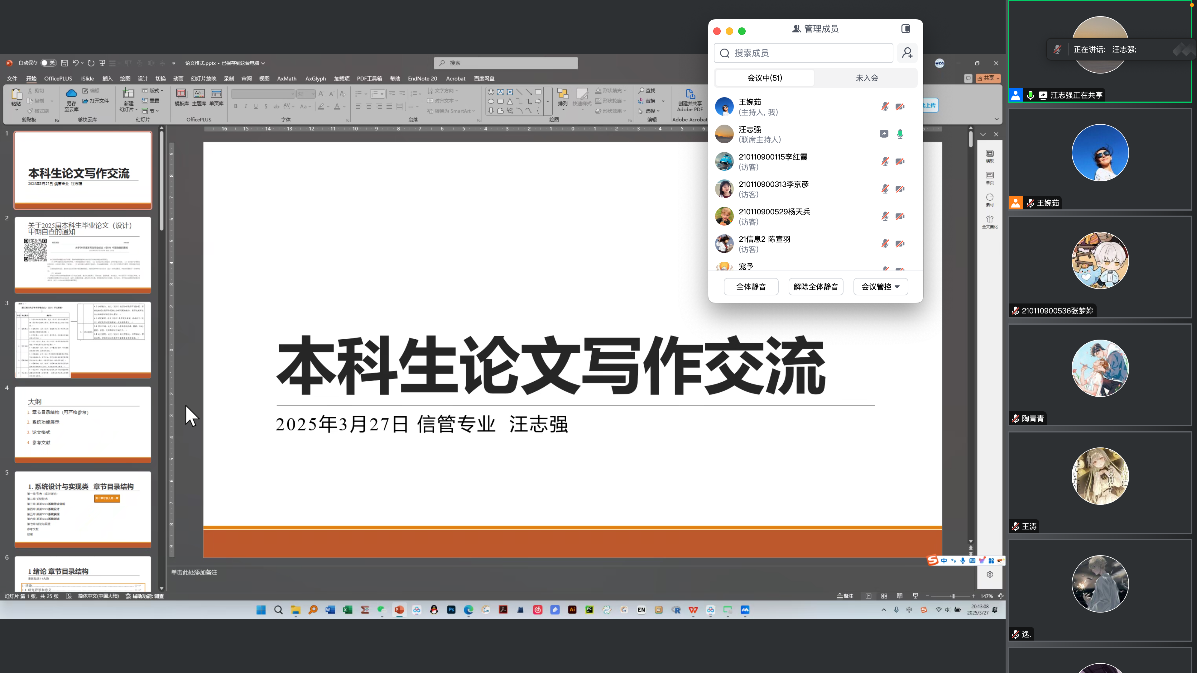 2025年3月27日晚上,球神直播 信息管理系在线上腾讯会议举行2025届信管毕业论文(设计)辅导会。本次讲座由信管系主任王婉茹老师主持,汪志强老师做毕业论文写作辅导交流,全体2025届信管毕业生线上参加了本次辅导会。