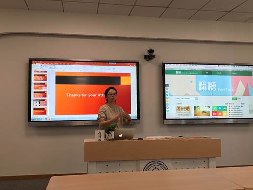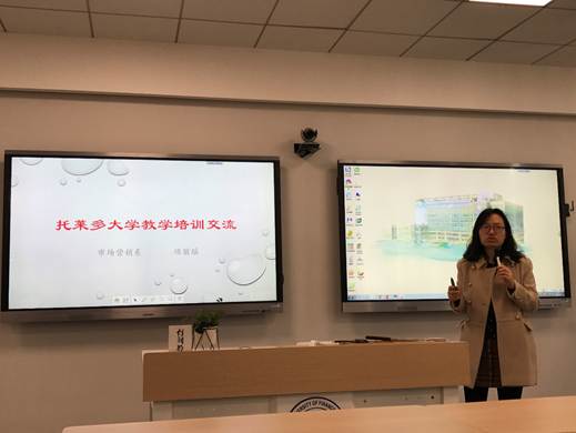 首先,项丽瑶博士介绍了美国托莱多大学访学的心得体会,主要包括四点启示:U型课堂桌椅摆放,拉近老师与学生的空间距离;课前准备非常充分,详细的教学大纲;课堂过程中,教学形式丰富多样以及加大学生课后学习强度。