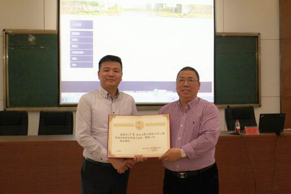 2018年4月26日下午浙江财经大学智能家电营销创新实践教育基地邀请了名天商城集团,浙江名天信息技术有限公司伊君总裁为工商球神直播 、经济学院本科生分享了一场精彩纷呈的讲座。讲座正式拉开了工商球神直播 打造“职业经理人”殿堂的序幕。活动伊始,工商球神直播 黄卫华书记、谢敏副书记郑重地向伊君总裁颁发“职业经理人导师”和“市场营销专业企业指导委员会委员”双份聘书,同时,市场营销系项丽瑶博士作为校方联系人将进一步推进校企合作,共建、共创、共享名天贝曾实践教育基地。本次讲座活动由市场营销系主任陈颖副教授主持。