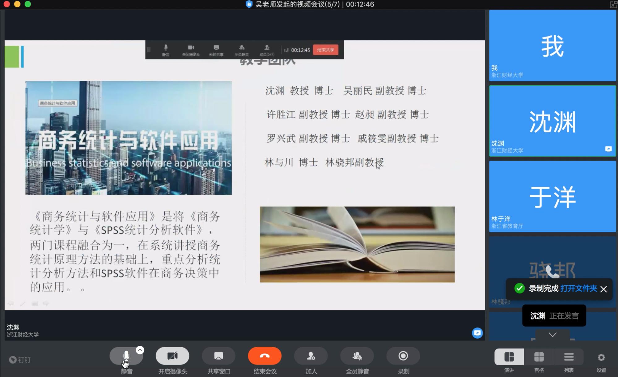 教学过程中如何结合学生的学习能力与专业背景适当调整教学方案,如何在疫情中做好直播教学并做好线上慕课与线下项目式实践教学相结合,是本次教学研讨的主要议题,沈渊教师做了专题发言。沈渊教授主要分享了一下四个问题:(1)《商务统计于软应用》在开课近5年来所取得的省一流课程、校在线精品课、校大类平台课程以及出版了校重点教材等成绩。(2)基于专业能力、分析能力、方法能力、互动交流、批判性思维能力等构建等能力体系为导向设计实验课程。采用项目式教学,融合多维度能力培养目标,并通过课程组竞赛的形式激励学生积极投入。(3)以浙江省平台慕课为主要教学资源,采用钉钉、zoom等直播平台,配合线下翻转,师生互动探讨项目进展中存在的问题。(4)探讨如何通过备课群集体备课,发挥集体的智慧,做好教学质量保证?如何掌控听课质量问题等。