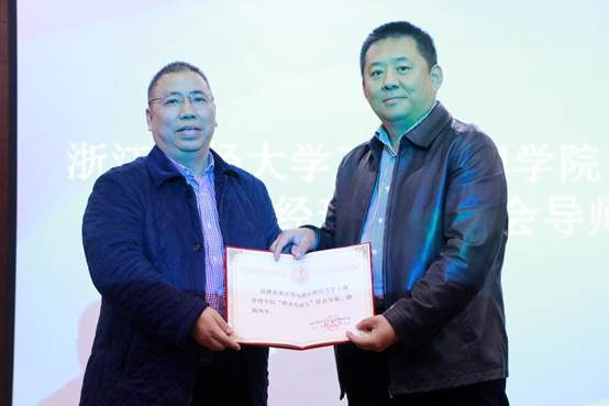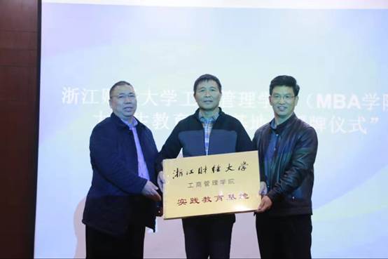 紧接着,院长董进才、党委书记黄卫华共同为宁波水星环保科技有限公司、宁波日盈食品有限公司,分别授予“浙江财经大学工商球神直播 (MBA学院)实践教育基地”牌匾,并宣布实践教育基地的建立。而后,党委书记黄卫华为宁波关键点品牌策划有限公司首席咨询师黄江伟颁发“职业经理人”社会导师聘任仪式。
