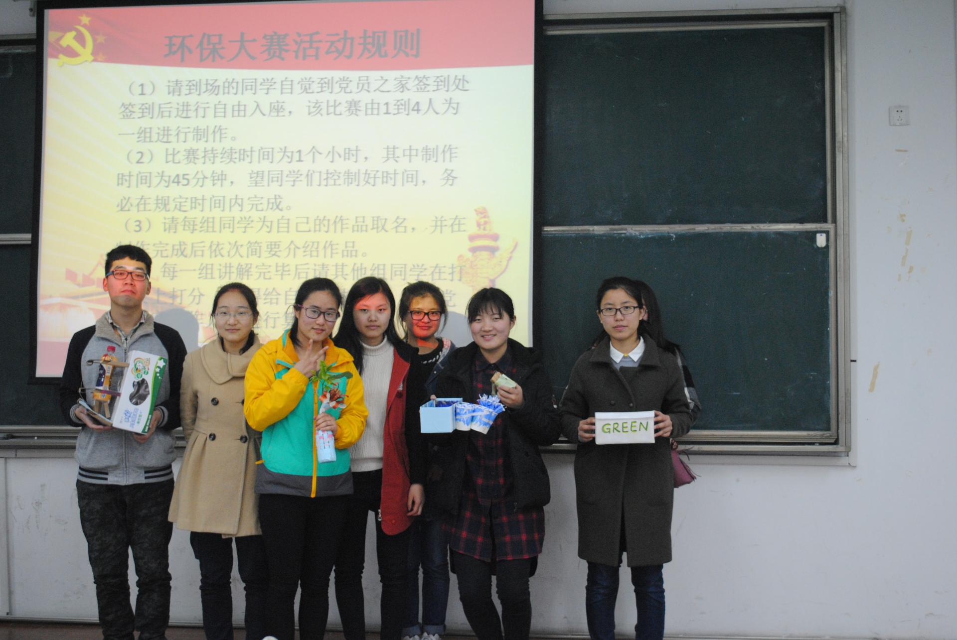 楼115教室举行“地球一小时”环保创意大赛活动——用学生党员之家提供或参赛者自带废品制作手工作品。比赛中选手们是将废品变成了一个个别出心裁的装饰品,小小的装饰品中寄托着让世界上更多的人感受到新鲜的空气,没有废弃物污染的美丽的世界的愿望。