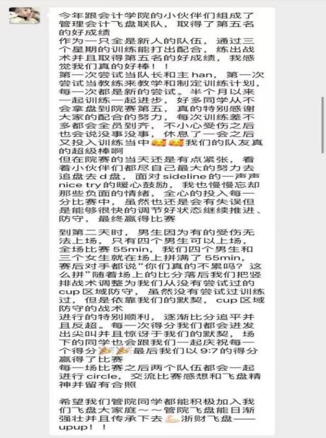 Q:听说管理会计联队在成员平均接触飞盘一年不到的情况下就拿下了校赛前八,是一只特别棒的队伍,小煊队长有什么想对大家说的呢?