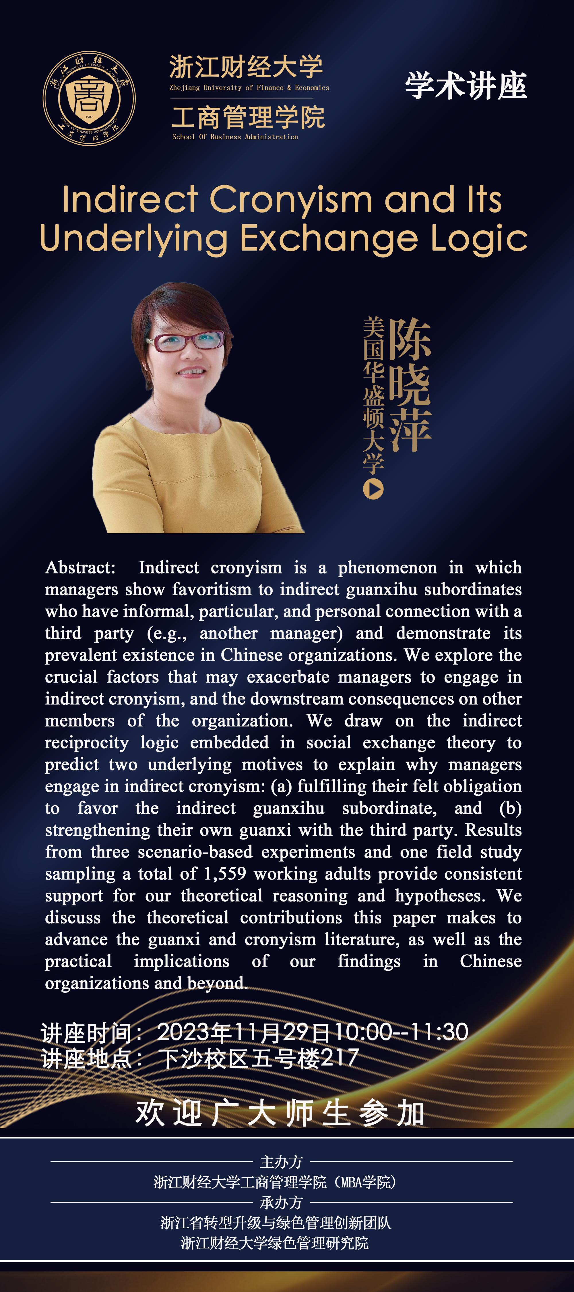 【讲座预告】陈晓萍教授:Indirect Cronyism and Its Underlying Exchange Logic