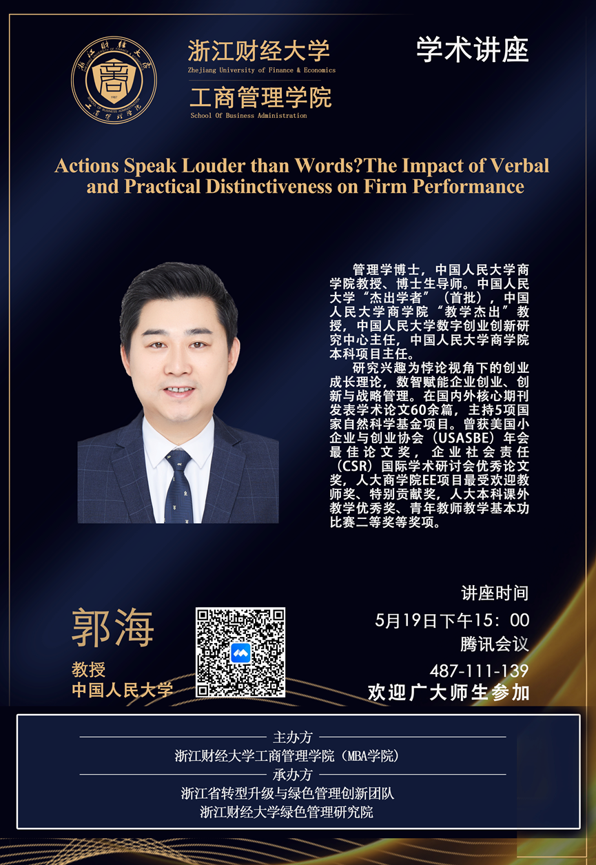 【讲座预告】郭海教授:Actions Speak Louder than Words? The Impact of Verbal and Practical Distinctiveness on Firm Performance