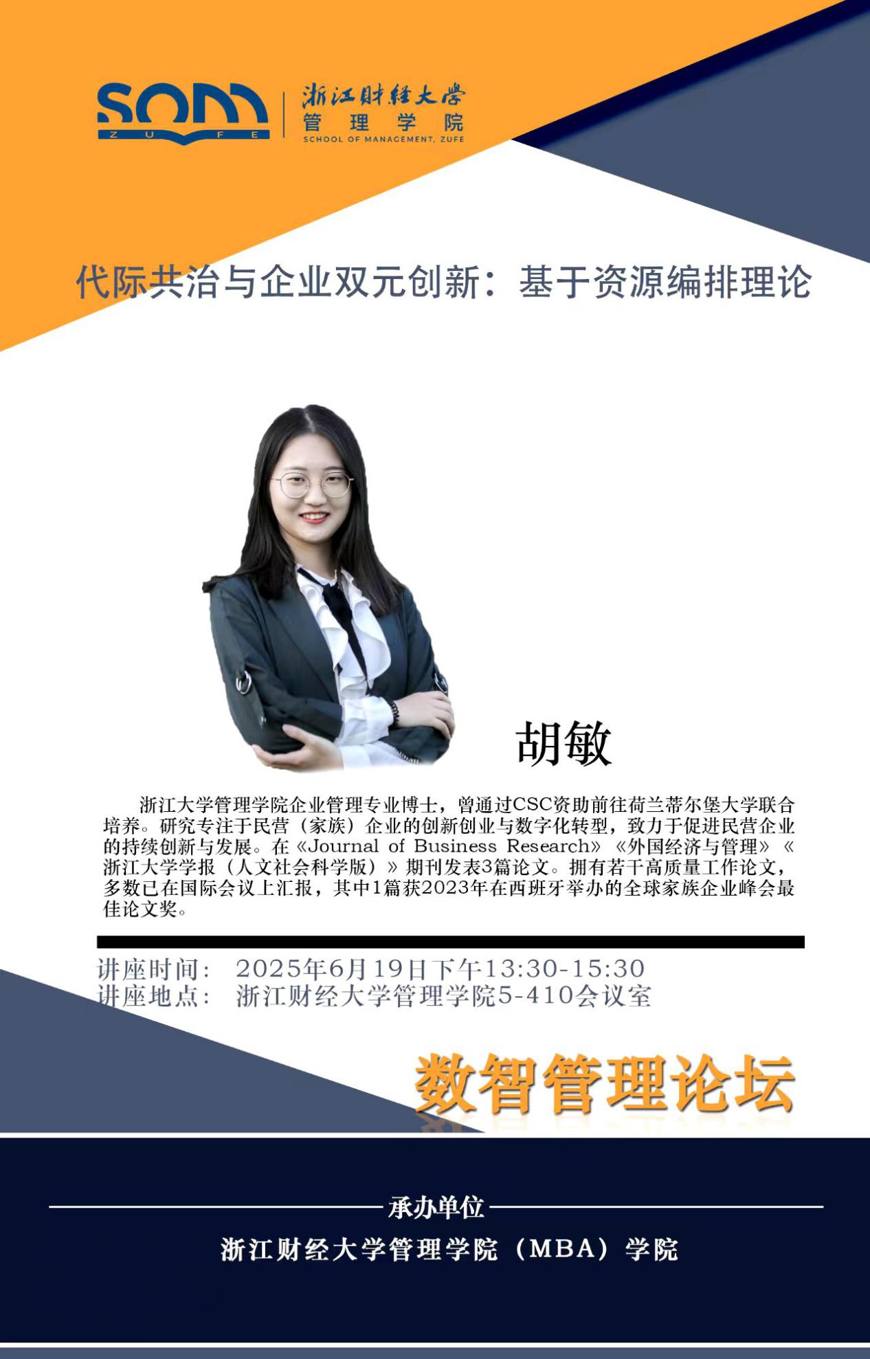 球神直播 新财经战略系列学术活动2025年第45期【学术报告】胡敏:代际共治与企业双元创新:基于资源编排理论