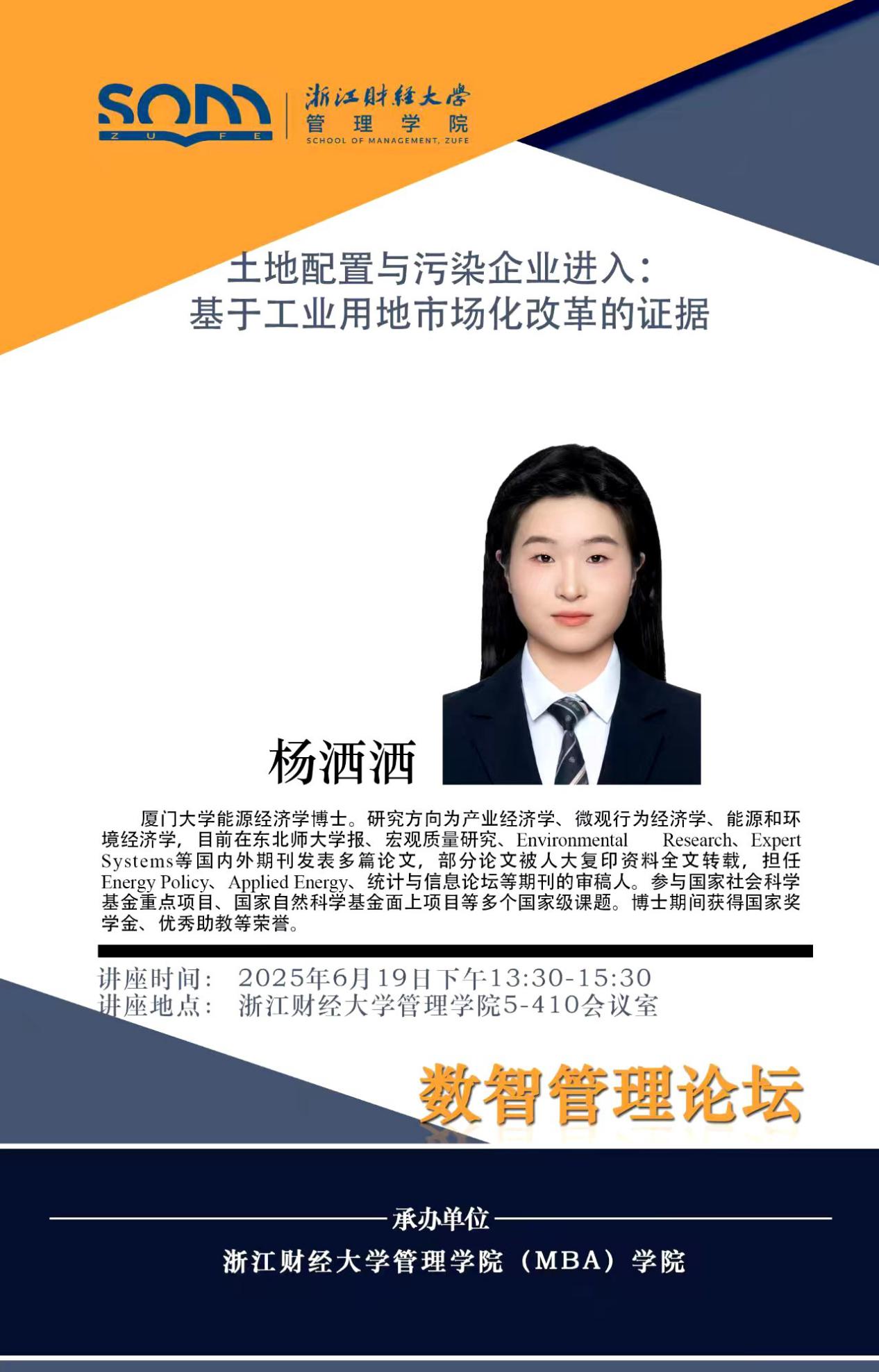 球神直播 新财经战略系列学术活动2025年第46期【学术报告】杨洒洒:土地配置与污染企业进入:基于工业用地市场化改革的证据