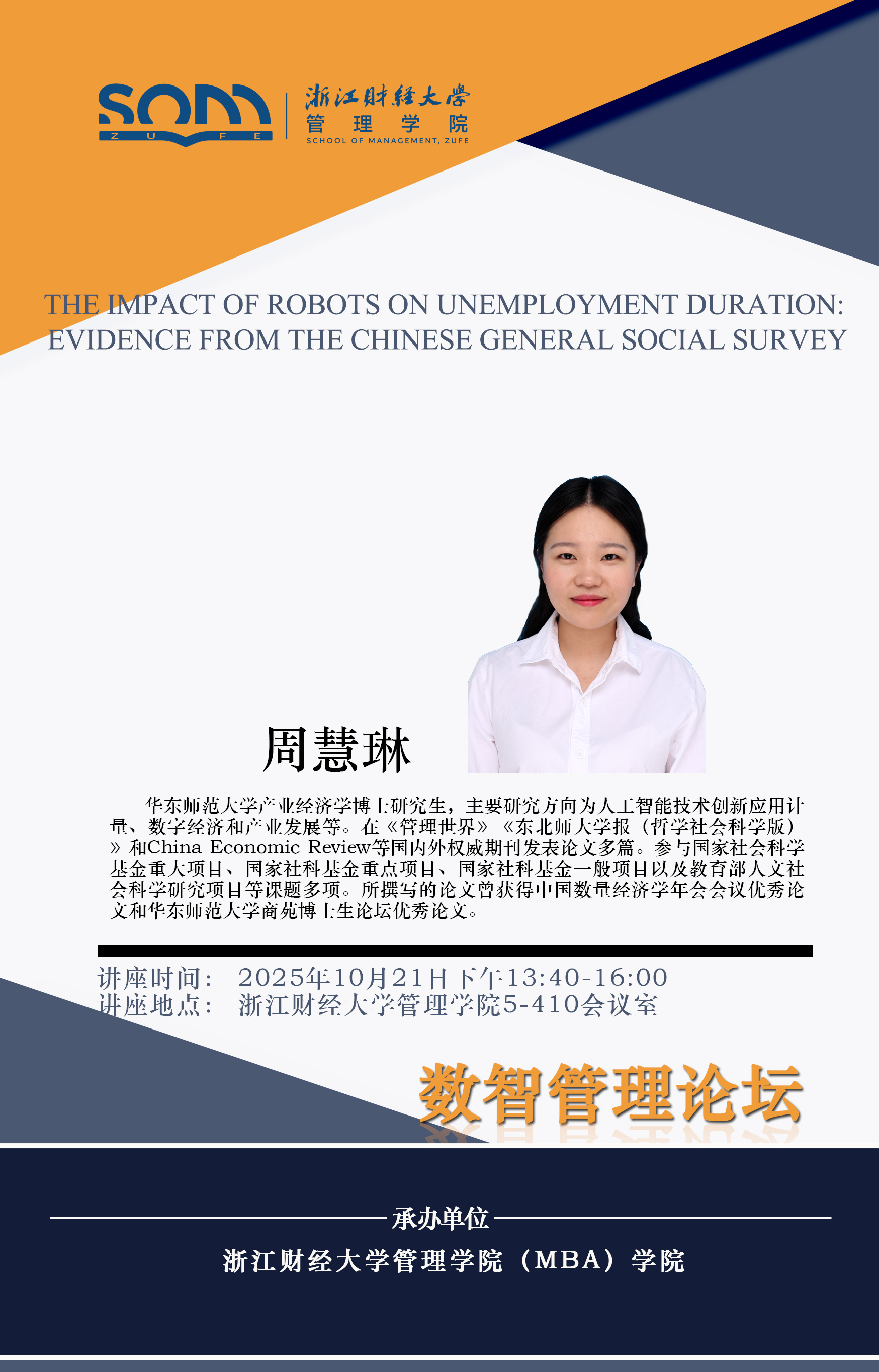 球神直播 新财经战略系列学术活动2025年第56期【学术报告】周慧琳:The Impact of Robots on Unemployment Duration Evidence from the Chinese General Social Survey