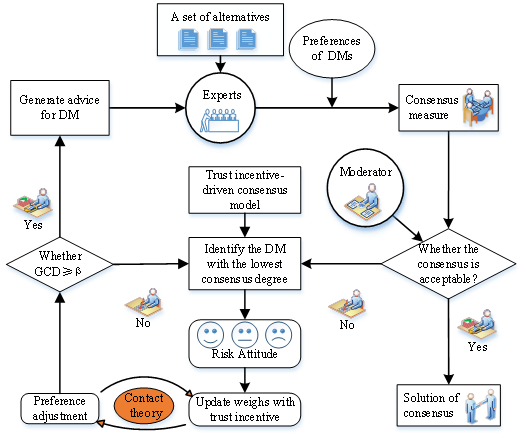 论文针对社交网络群体决策中权力结构的分布和策略性操纵行为对决策公平性和效率带来的挑战,提出了一个新的共识理论框架,专门设计用于分析权力结构并防止社交网络群体决策中的策略性操纵行为。该框架提出了基于中心性度量的影响力的指数和基于结构洞与图密度的权力指数,分别用于识别社交信任网络中的意见领袖和子群的权力动态。接着,论文提出了一个基于最大熵模型来探索社交网络群体决策中的权力动态偏好聚合。此外,论文还引入了一个基于边界最大共识度的反馈模型,解决了现有共识方法往往忽视的问题,包括决策者的自尊和操纵行为的风险。该模型在调整偏好时考虑了子群的自尊,旨在防止潜在的策略性操纵,增强决策的公平性和效率。最后,通过彻底的数值评估和比较评估来证实所提出方法的有效性。实验结果表明,集中的权力可以加快共识形成,但可能损害公平性,而分散的权力虽然减慢共识,却增加了参与度和多样性,降低了权力滥用的风险。