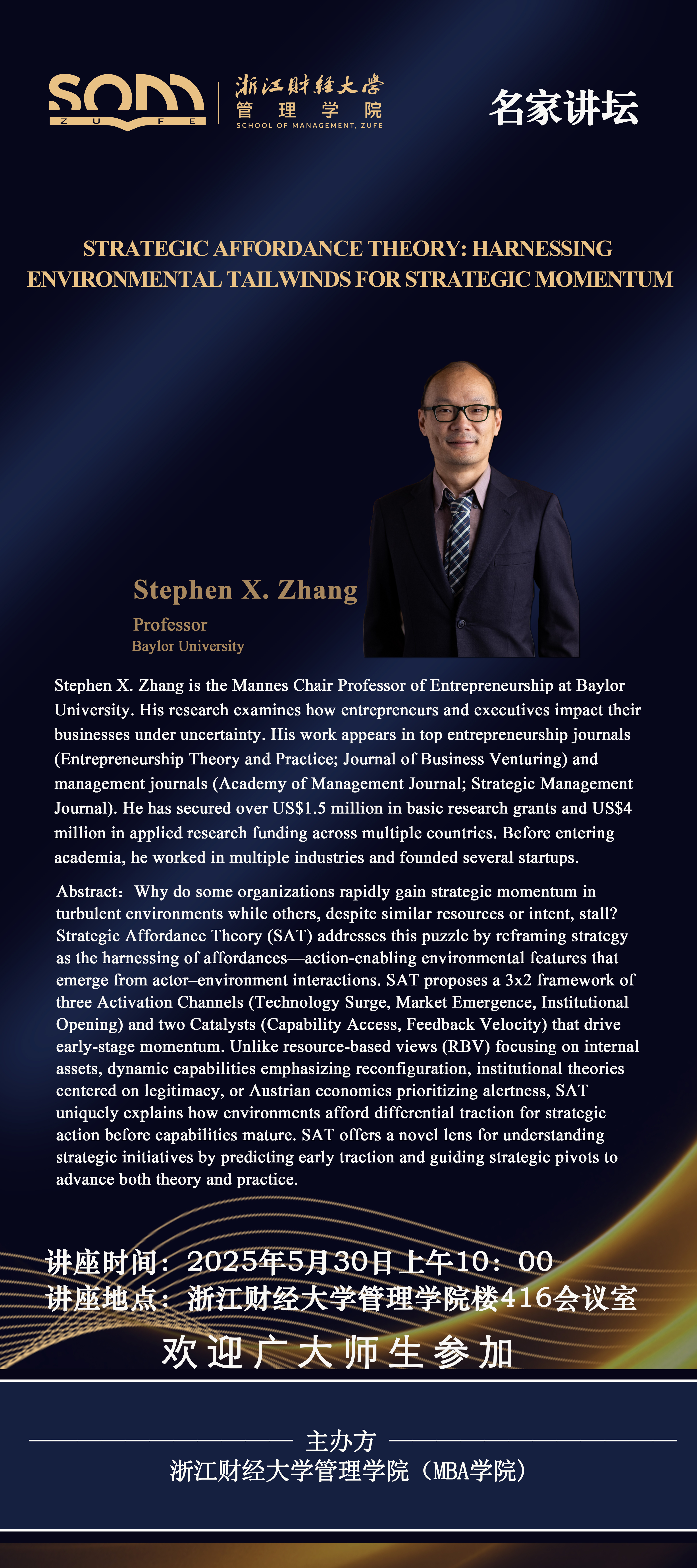 管理学院新财经战略系列学术活动2025年第41期【名家讲坛】Stephen X. Zhang:Strategic Affordance Theory :Harnessing Environmental Tailwinds for Strategic Momentum