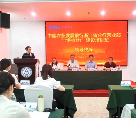 2024年7月26日,由浙江财经大学管理学院承办的中国农业发展银行浙江省分行营业部“七种能力”建设培训班在校外培训基地顺利举行。中国农业发展银行浙江省分行营业部党委书记、总经理顾烈,浙江财经大学校党委委员、副校长董进才,中国农业发展银行浙江省分行营业部党委书记、总经理顾烈,浙江财经大学管理学院党委书记朱力明等出席开班仪式,顾烈、董进才分别代表浙江省农发行营业部和浙江财经大学做了开班动员讲话。