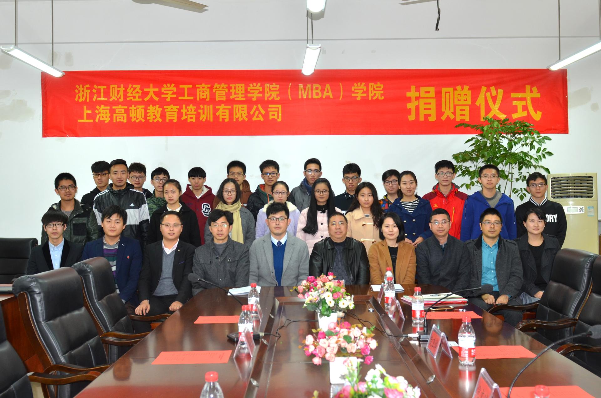(MBA学院)与上海高顿教育培训有限公司校企合作暨捐赠仪式在学院楼410会议室举行。学院党委书记黄卫华、浙江财经大学校友办副主任孙莹、副院长王建明、高顿教育培训有限公司的副总裁王贤瀚、浙江大区市场经理陈旭、市场推广总监余欣钰,以及学办主任胡星平、团委书记喻一珺、20位15、16级同学代表参加了本次签约暨捐赠仪式。
