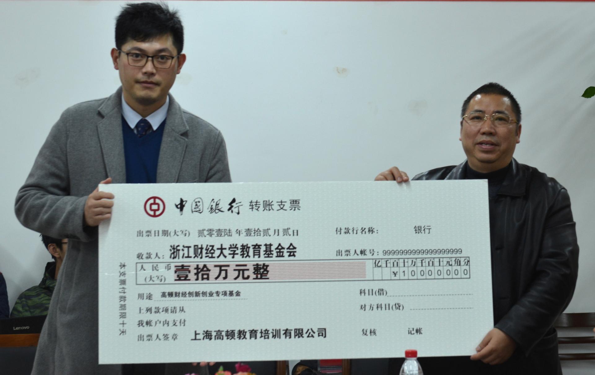 随后,学院党委书记黄卫华、浙江财经大学校友办副主任孙莹、上海高顿教育培训有限公司副总裁王贤瀚举行了三方签约仪式。高顿财经王副总裁向黄卫华书记交递了捐赠支票,王建明副院长向高顿财经王副总裁颁发了捐赠证书与纪念杯。最后,捐赠仪式全体参与人员进行了合影留念。