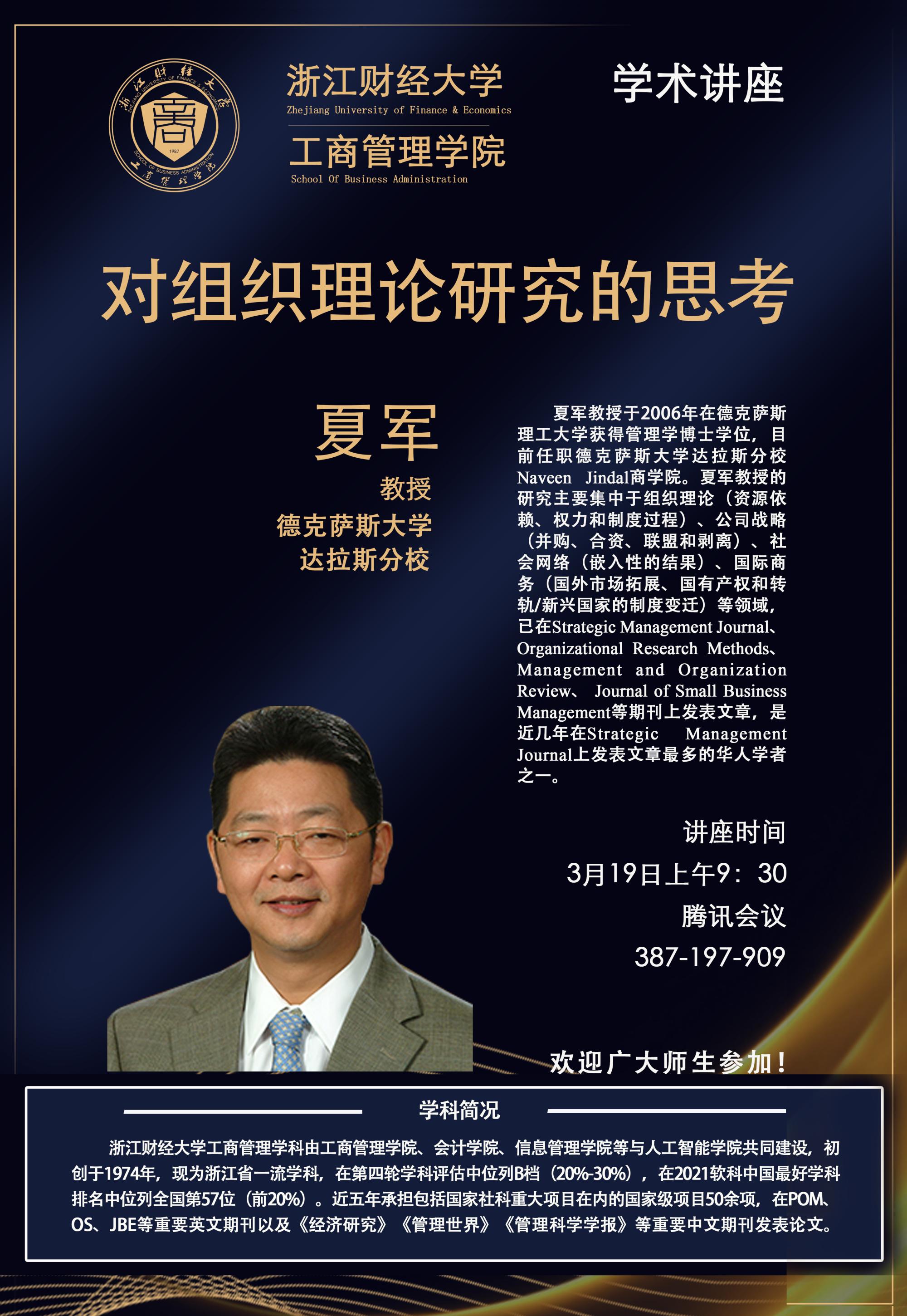 夏军教授目前任职德克萨斯大学达拉斯分校Naveen Jindal商学院。夏军教授的研究主要集中于组织理论、公司战略、社会网络、国际商务等领域,已在Strategic Management Journal、Organizational Research Methods、 Management and Organization Review、Journal of Small Business Management等期刊上发表文章,是近几年在Strategic Management Journal上发表文章最多的华人学者之一。